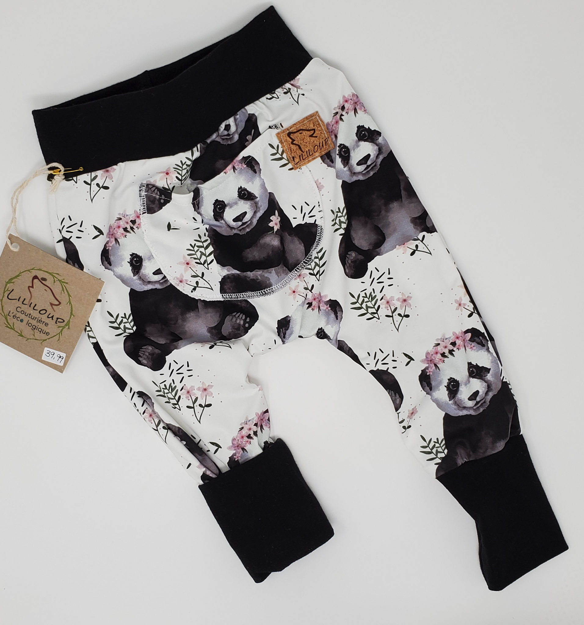 Pantalons évolutifs conçu et fait à Granby. Les tissus sont imprimés au Québec avec les illustrations d'Odette Mailloux.
